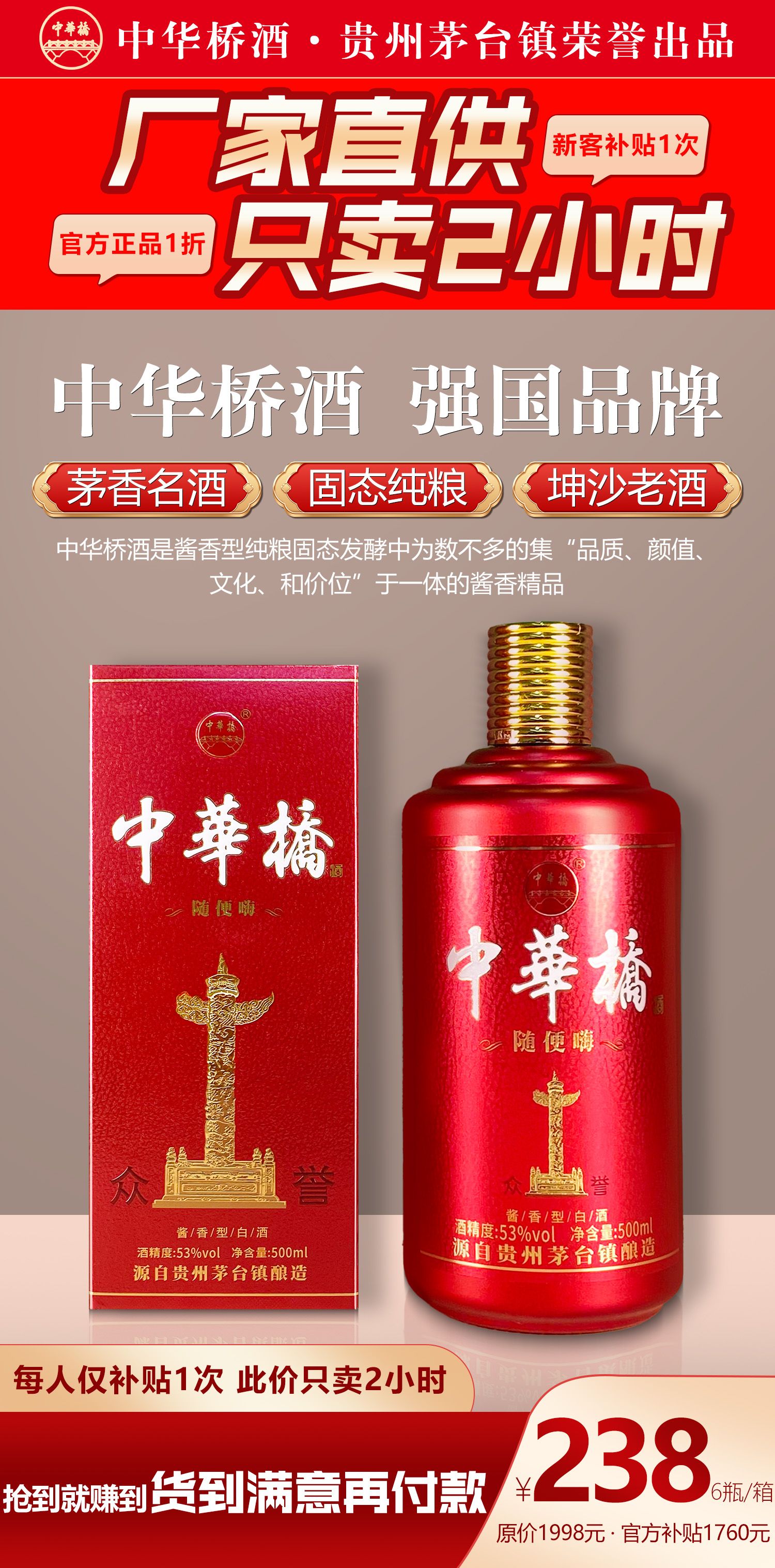 ¥1760限量款【中华桥酒】贵州经典高端酱酒!1箱6瓶,货到付款,您满意再付款。